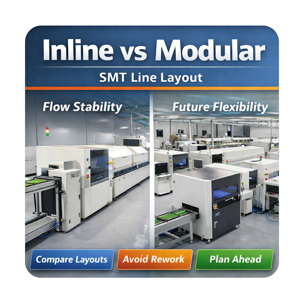 Inline uspořádání vyniká stabilními, velkoobjemovými běhy s nepřetržitým průtokem a vysokorychlostním umístěním jako JUKI a Hanwha. Modulární uspořádání nabízí lepší odolnost vůči změnám, vysoký mix, nízké objemy a budoucí rozšíření se snazší integrací inspekce ICT a vyrovnávacích pamětí. Správná volba závisí na produktovém mixu, objemové stabilitě, plánech kontrol a toleranci budoucích nákladů na změny – nejen na počátečním prostoru nebo ceně. Použijte 5bodový kontrolní seznam, abyste odpovídali své skutečné situaci a vyhli se pozdějším nákladným přepracováním.